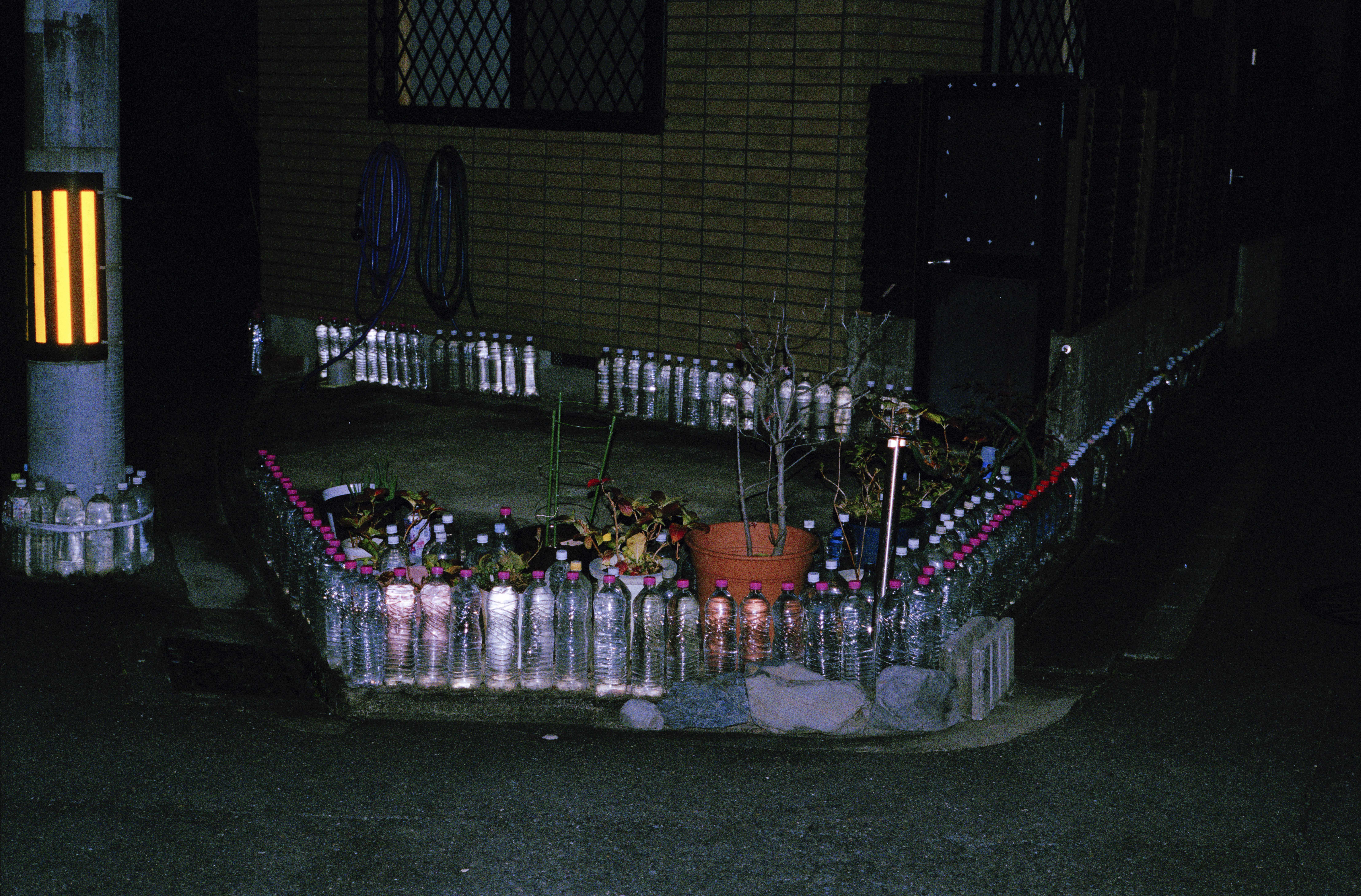 これらの写真は、目の前の光景を明確に把握できなかった瞬間に撮られました。啓示を求めてフラッシュを使ったにもかかわらず、その光はむしろ謎を深めました。その疑念は、大判プリントにしてからもなお残っています。「私は本当に何を見ているのか?」――それは枝にぶら下がった白いビニール袋なのか、それとも夜の風景に溶け込んだシロフクロウなのか? そして、プラスチックボトルでできたあの奇妙な柵は一体何なのか? 猫を近づけないための仕掛けなのか、それとももっと象徴的な意味があるのか? 日本における水の浄化的儀式との関連性? そこでは、フラッシュの反射そのものが清めの行為となるのか?