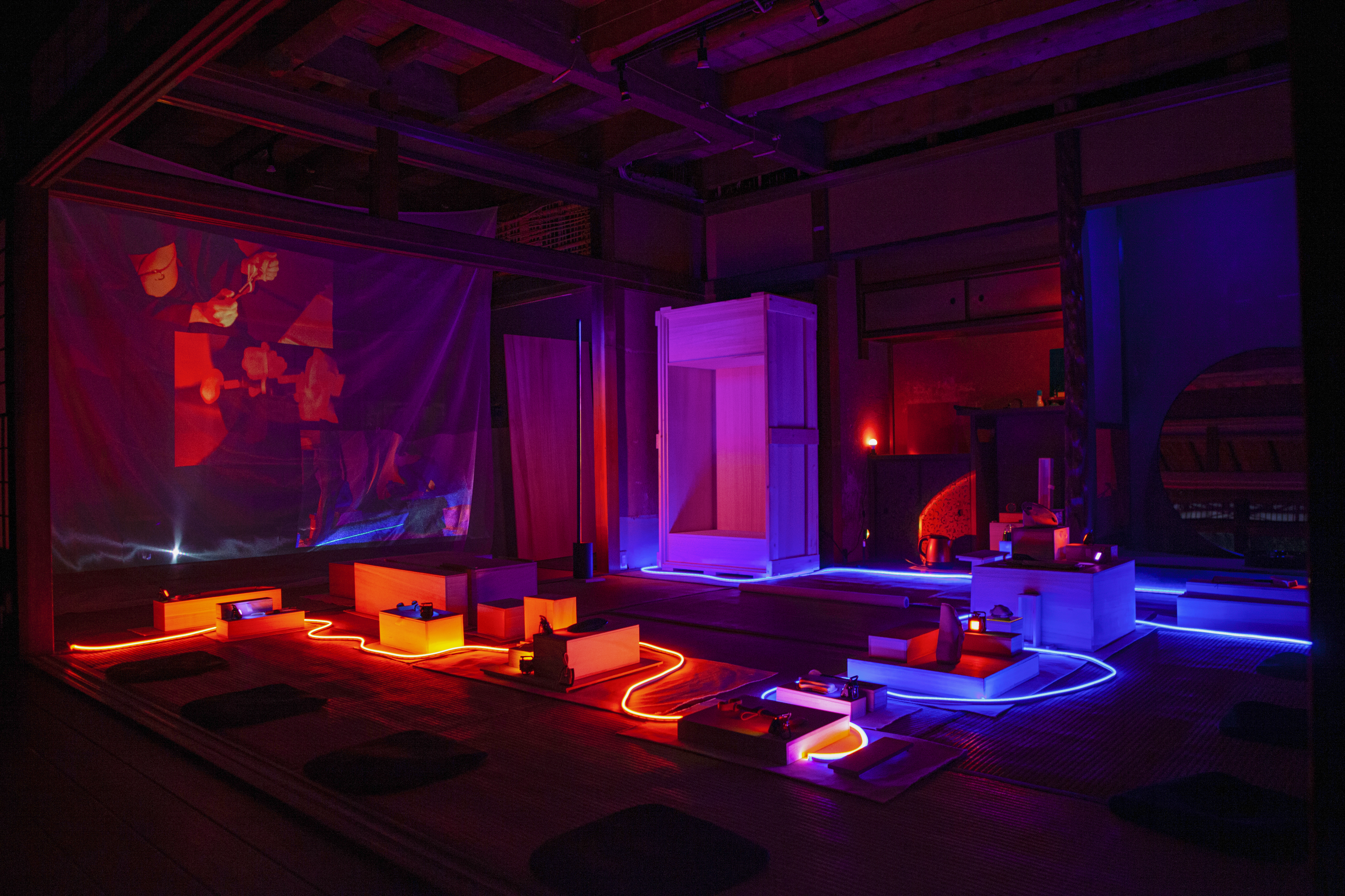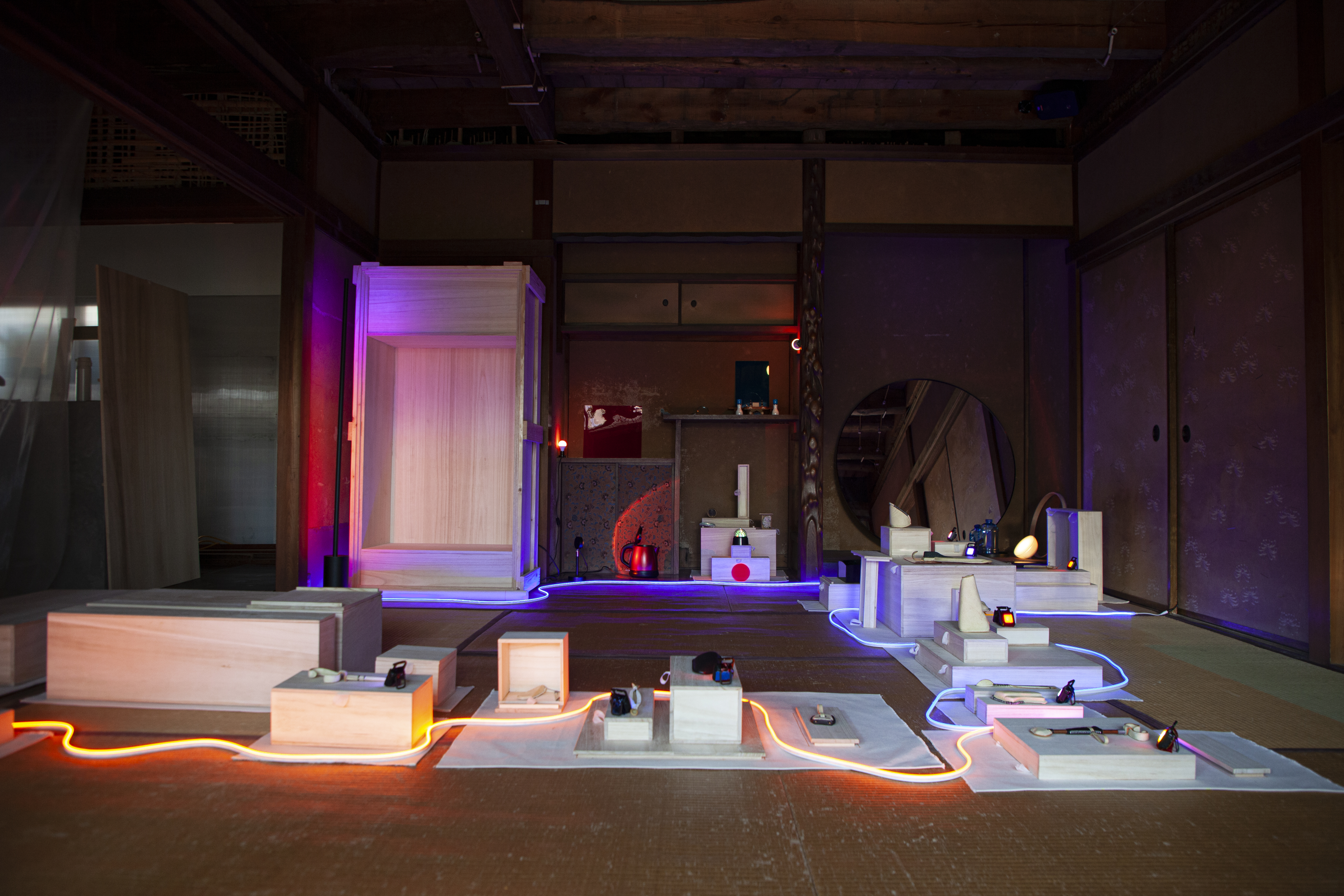 La production de ce mobilier ornemental – devenu central à la cérémonie – est ainsi une spécificité de ce volet. De plus, cette nouvelle itération se voit déployée dans un lieu inédit, une ancienne machiya (maison traditionnelle kyotoïte) rénovée récemment de manière contemporaine, et constituant un cadre différent des espaces en béton où jusqu’alors la performance s’était déroulée.