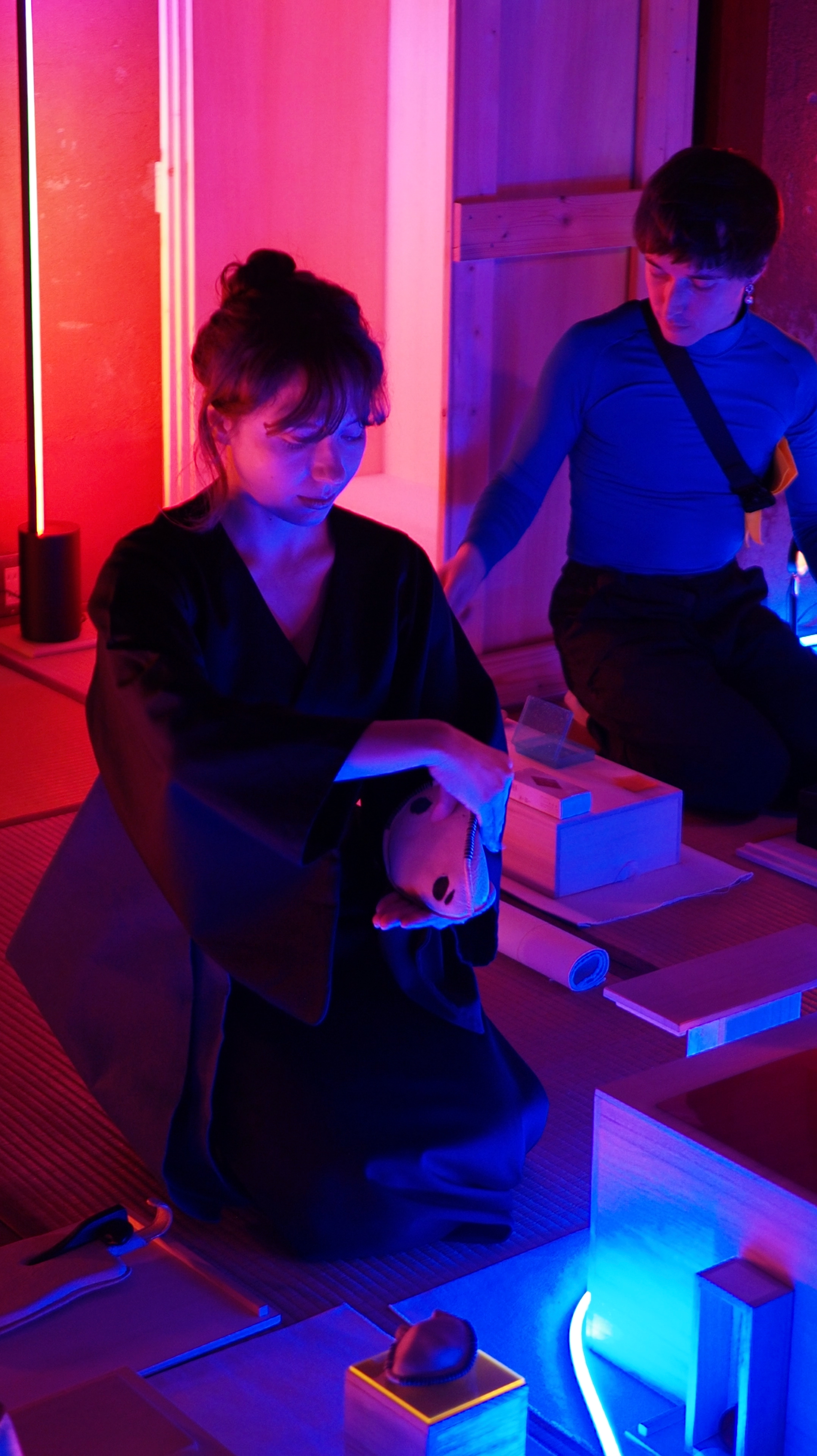 This combination of objects, gestures, and scenography, borrowing its dramaturgy from the art of tea, creates a suspended, ritualized space-time, conducive to contemplation. For this episode, we have centered the scenography around a key object that encapsulates the essence of Monomi: at the intersection of scenography, gesture, and sculpture. It is a miniaturized hakonoma—a hakonoma, the ma of boxes, within which multiple box-pedestals are contained. These pedestals both protect and transport JN. Mellor Club’s Objects/Tools, with each box-pedestal precisely tailored to its contents. The production of this ornamental furniture—now central to the ceremony—is a defining feature of this version.