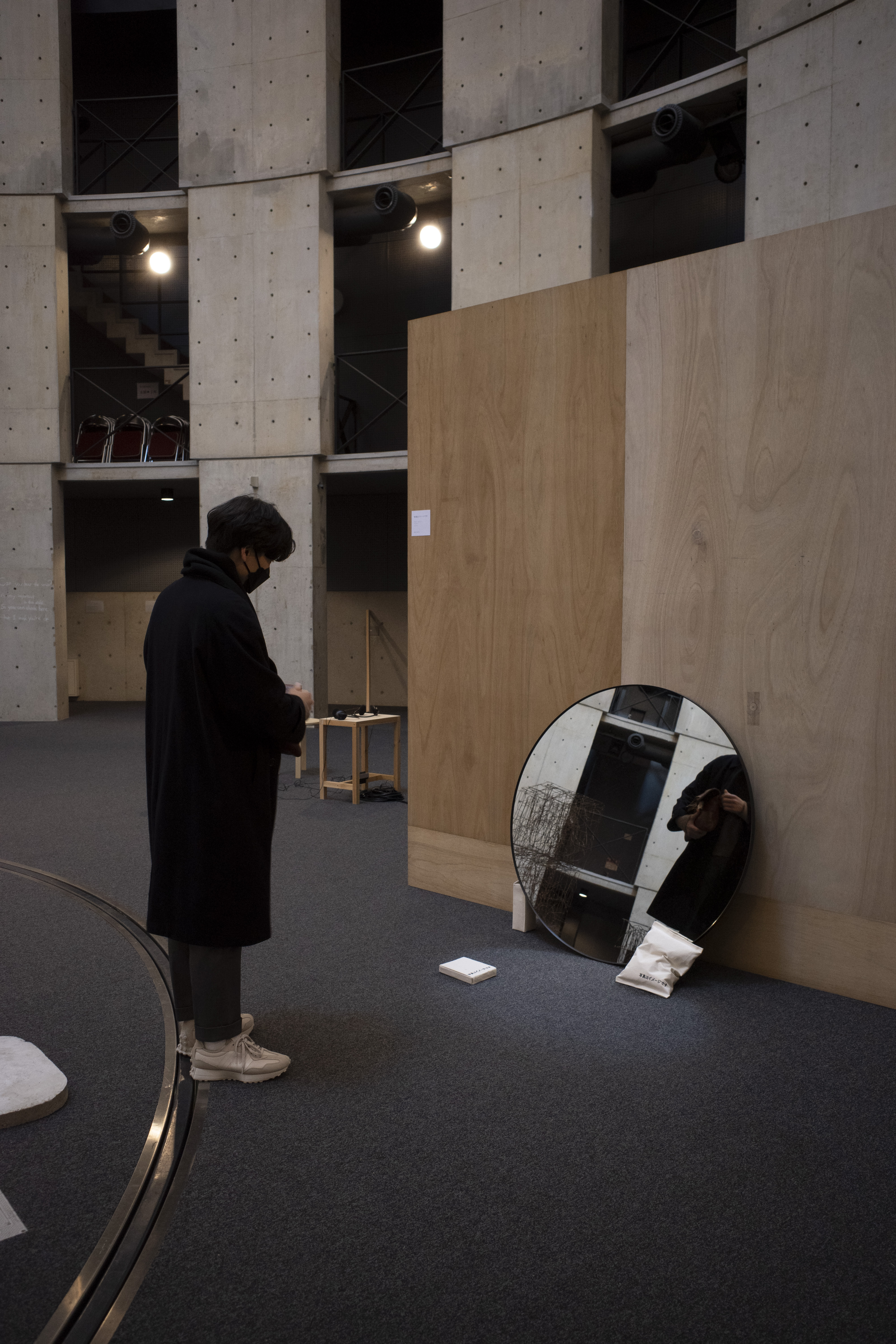 丸い鏡の存在は、美術史におけるこのモチーフの使用、とりわけルネサンス絵画における円形構図(トンド)と、それが持つイリュージョンやヴァニタス(虚無)の象徴と結びついています。鏡は視覚の装置として機能し、「写真=イメージ」と同様に、見る者の視点を反射し、枠づけます。